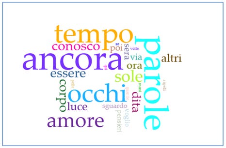 Va precisato che l’elaborazione delle frequenze elaborata da Voyant Tools non tiene conto della lemmatizzazione: forme flessionali della stessa parola vengono conteggiate separatamente. Inoltre, la frequenza delle parole riflette l’aggregazione dei diversi valori che una parola può avere: ad esempio, la frequenza dell’avverbio “ancora” risulta dall’aggregazione dei valori temporale, intensivo e aggiuntivo. Ho escluso dalla rappresentazione grafica parole grammaticali molto comuni quali articoli, preposizioni, congiunzioni, pronomi e gli avverbi “non”, “più” e “come”, che solitamente hanno la più alta frequenza d’uso in ogni testo.